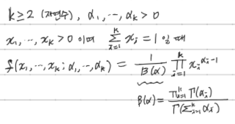 디레클레 분포 k차원 벡터 요소 모두 양수이며 모두 더한 값이 1인 경우 확률값이 정의되는 연속확률분포 베이즈 확률에서 사전확률로 많이 사용됨