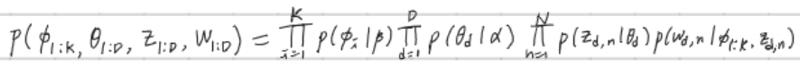 주제 단어 분포와 문서 주제 분포의 결합확률이 커지도록 해야 한다. LDA의 단어 생성 과정은 다음과 같은 수식으로 나타낼 수 있다.
