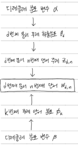 d번째 문서의 n번째 단어 주제를 나타내는 변수 z는 d번째 문서에 대한 주제 확률 분포를 나타내는 변수 θ에 영향을 받으며, 이 변수는 디레클레 분포 변수 α에 영향을 받아 디레클레 분포를 따른다. 마찬가지로, k번째 주제에 대한 단어 확률 분포를 나타내는 변수 Φ는 디레클레 분포 변수 β에 영향을 받아 디레클레 분포를 따른다.