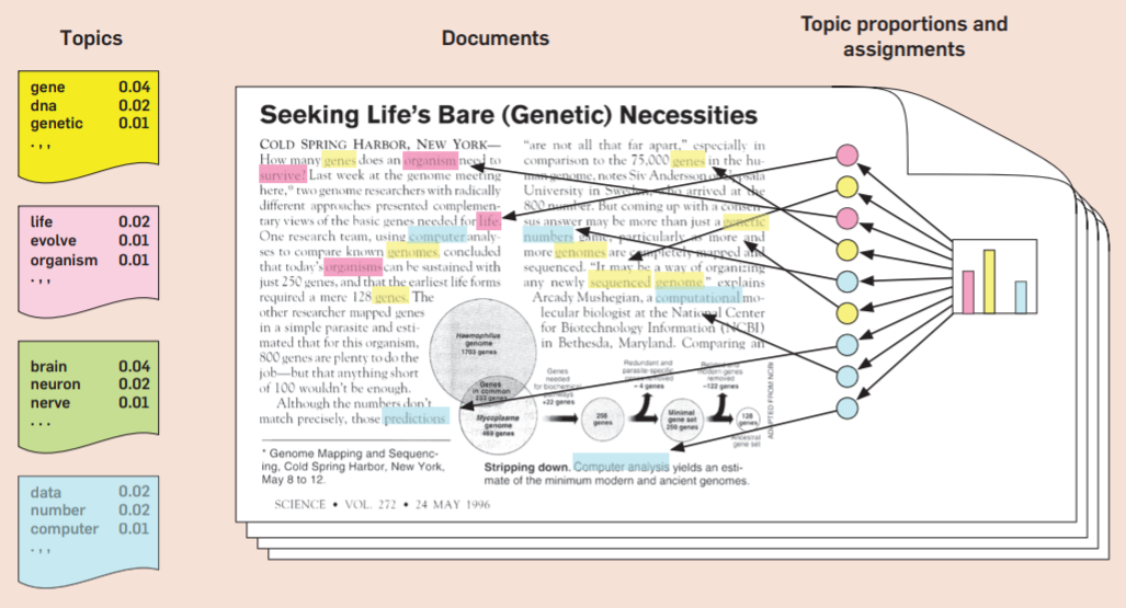 우리는 글쓰기를 할 때 먼저 주제를 정한 후, 어떤 단어를 쓸지 생각하면서 글을 쓰게 된다. LDA도 비슷한 맥락으로 이어진다. 문서의 말뭉치로부터 얻은 주제 분포로부터 주제를 뽑고, 그 주제에 해당하는 단어를 뽑아 문서가 생성되는 과정을 확률 모형으로 모델링한다.