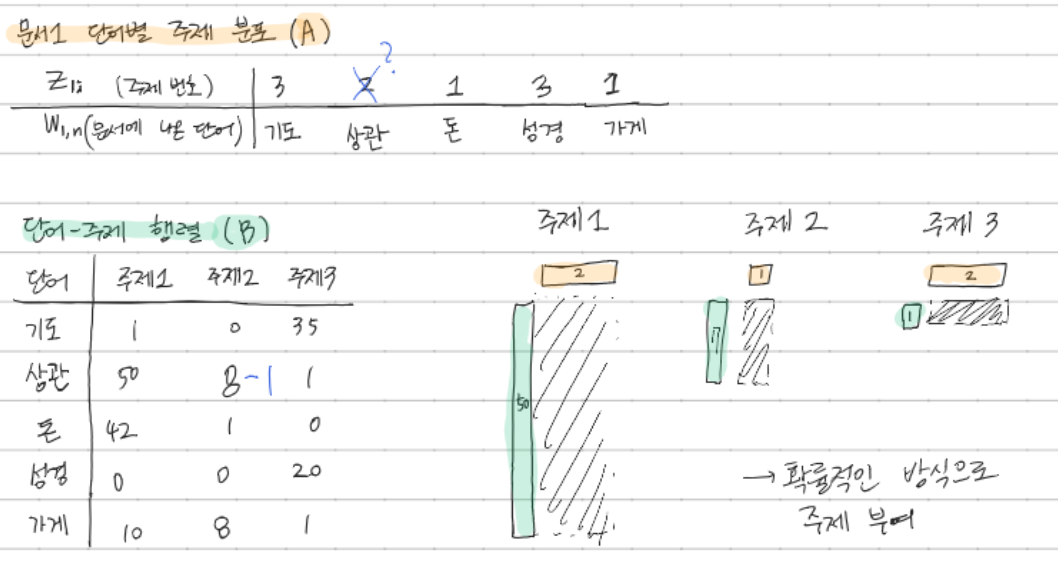 이를 예시를 통해 보다 쉽게 이해해보자. 어떤 문서에 아래 표의 5개 단어가 나오고, 각 단어의 주제가 다음과 같다. 또한 전체 문서에서 해당 단어가 어떤 주제로 나왔는지 그 수를 세어 단어-주제 행렬을 만들 수 있다. 이 상태에서 2번째 단어의 주제를 모른다고 가정해보자. 그러면 단어-주제 행렬에서 해당 단어의 해당 주제 개수는 1이 감소할 것이다. 이 두 값을 막대로 나타내고 면적을 구하면 위 식에서 의미하던 것을 나타낼 수 있다. 위의 식에서 A는 문서의 단어별 주제 분포 길이를, B는 단어별 주제 분포 길이를 나타낸다. 그리고 두 길이를 곱한 면적이 확률을 나타낸다. 따라서 이런 방식으로 모든 문서 및 단어에 대해 수행해주면 단어마다 주제를 할당할 수 있다.