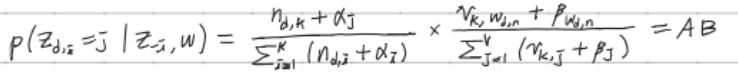 이를 이용하여 d번째 문서의 n번째 단어가 실제 j번째 주제가 될 확률을 구하면 다음과 같다.