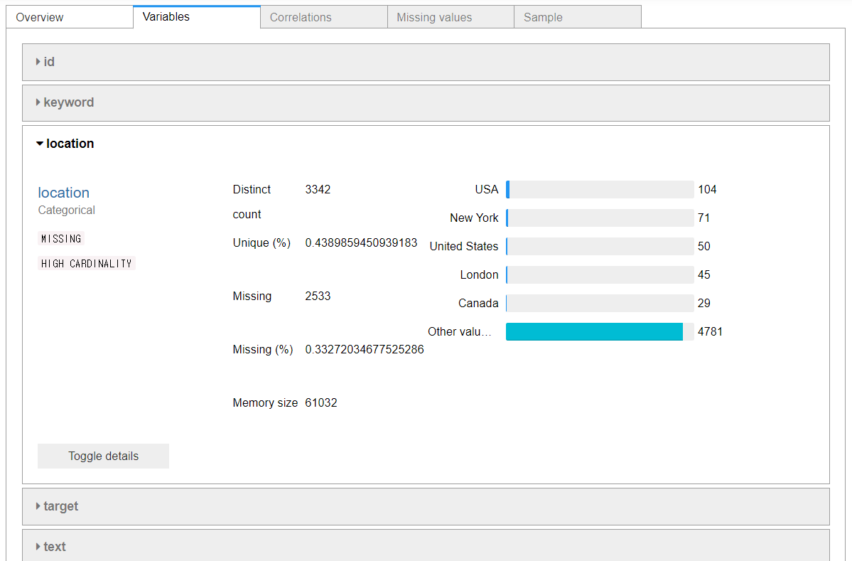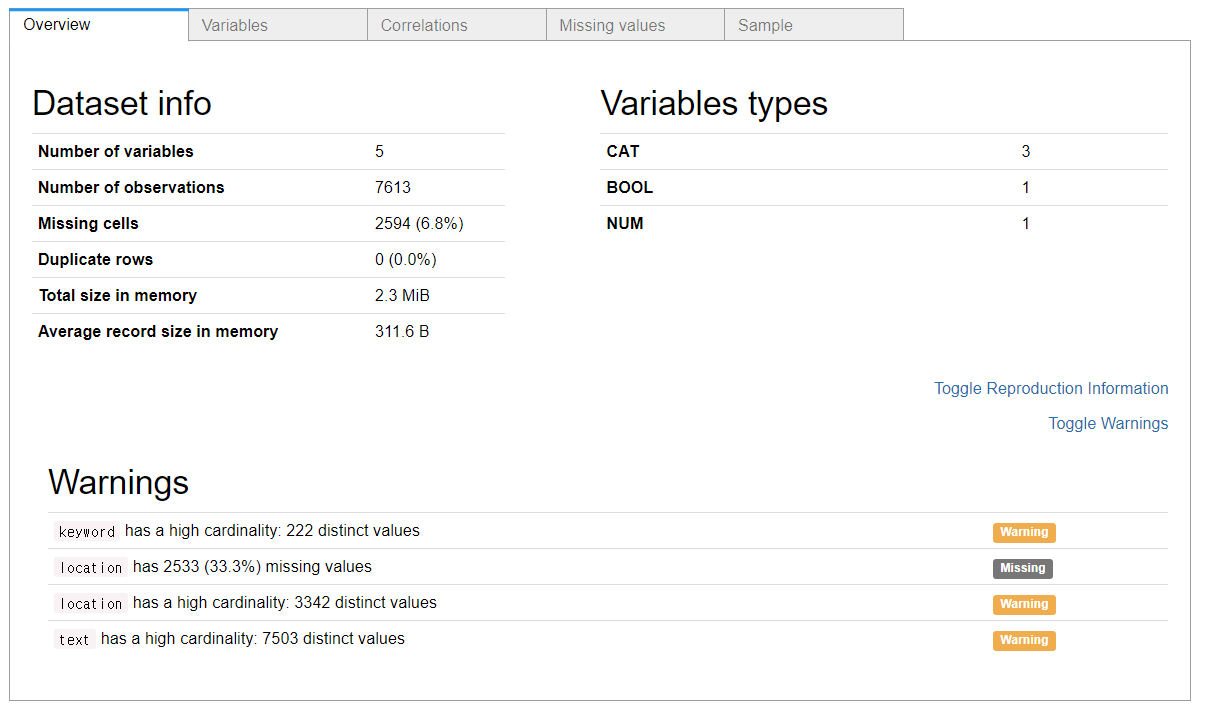 https://wikidocs.net/book/2155를 통해 NLP 공부를 하다가 발견하게 된 pandas_profiling 함수. 보자마자 이런 함수가 있다는걸 진작에 알았더라면 싶었다.
