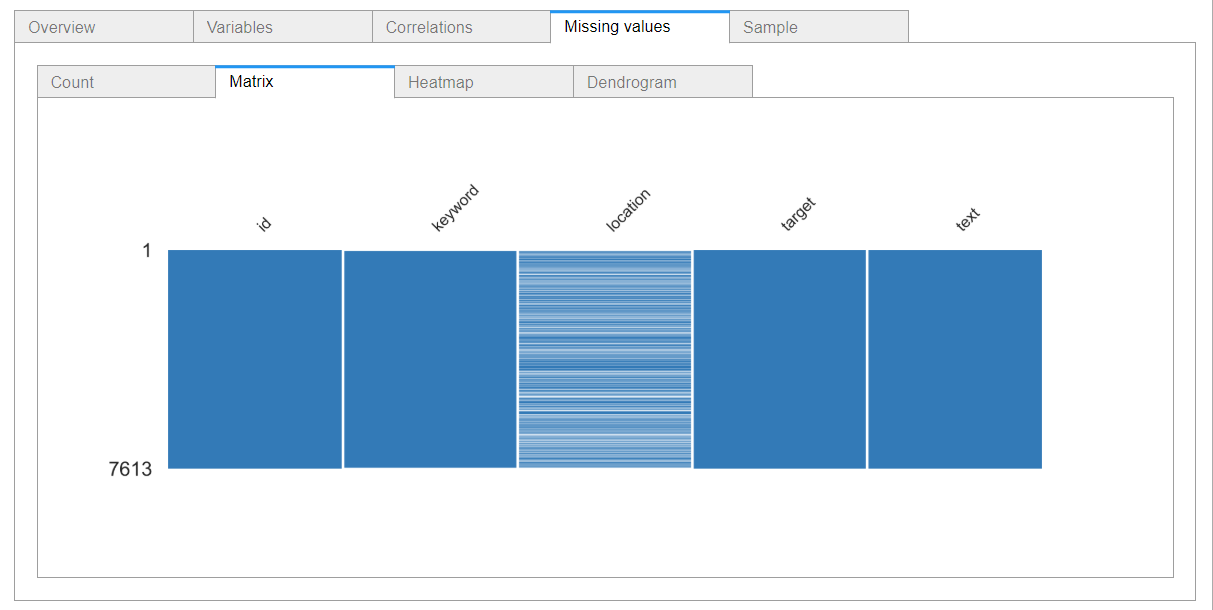 첫 화면 Overview에서는 변수 개수, 데이터 개수 및 NA 비율, 변수 타입 개수 등을 볼 수 있다.