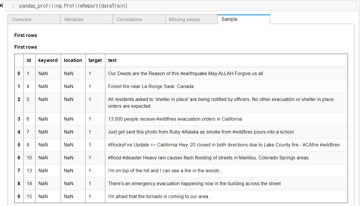 (데이터는 한창 준비하고 있는 Kaggle의 Real or Not? NLP with Disaster Tweet 대회 데이터를 이용했다.)