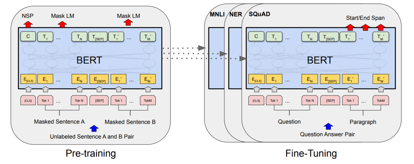 이러한 두 pre-train task를 통해 학습되어 있는 상태에서, 각자 downstream task에 맞게 fine-tuning하여 모델을 이용할 수 있다.
