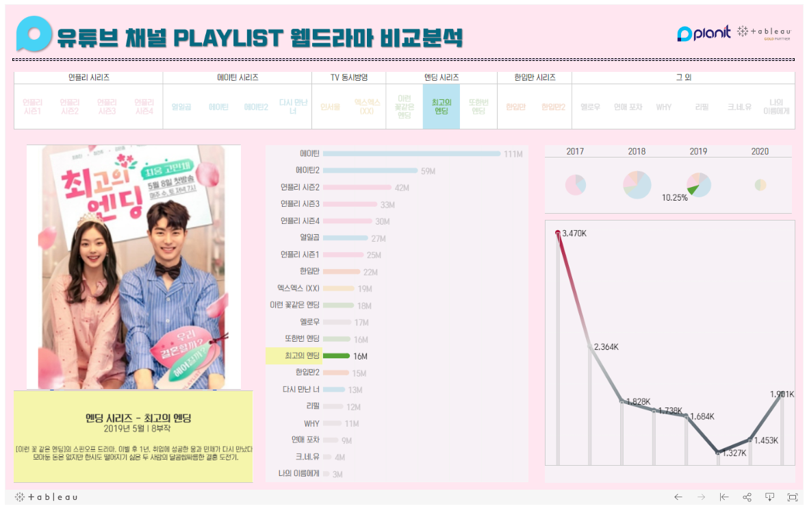 그 중 가장 관심있는 분야라 재미있게 만들었던 웹드라마 비교 분석 대시보드는 플랜잇 SNS에 소개되는 영광을 누렸다...🥺