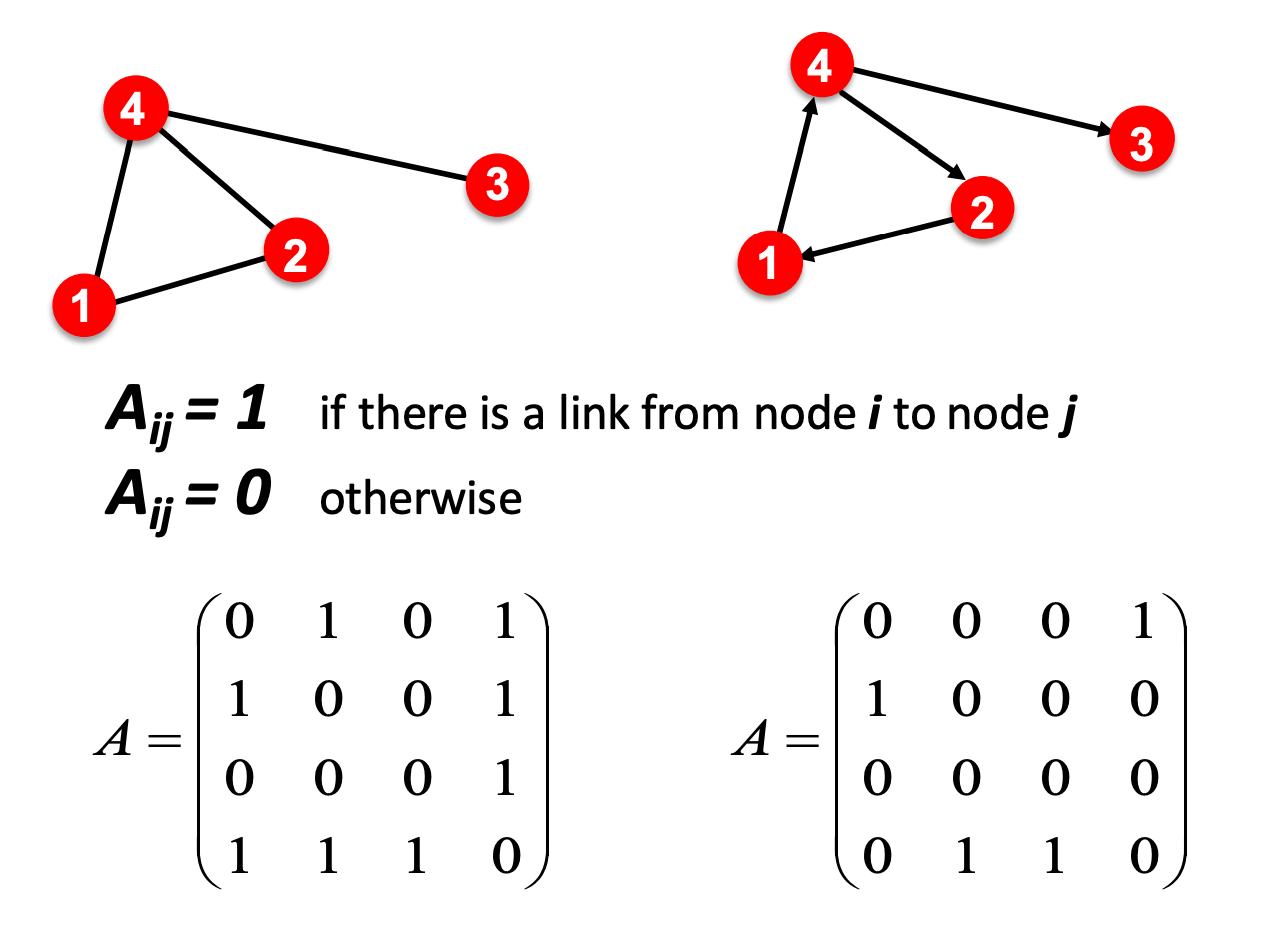 - matrix 내 (i, j) 원소값이 1이면, node i와 node j 사이 link가 있는 것