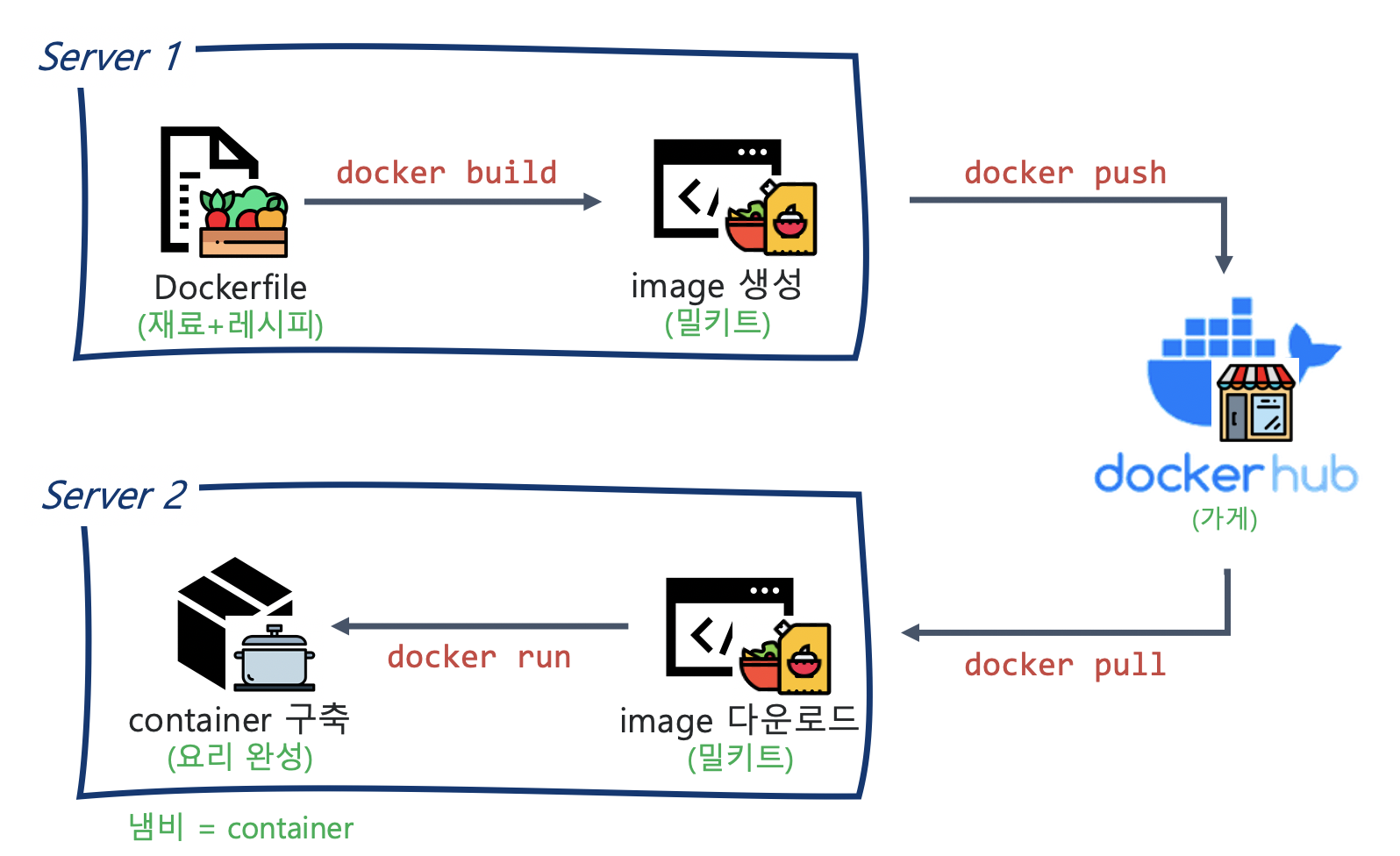 한번 밀키트 조리로 이 Dockerfile, image, 그리고 container 간의 관계를 표현해봤다.