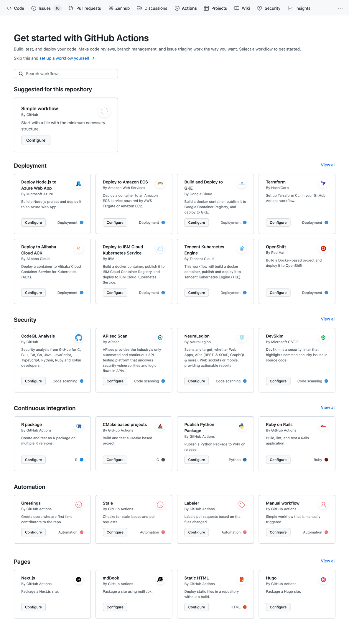설정을 원하는 repository에서 Actions 탭에 들어가면 배포, 보안, 자동화, 페이지 관리 등