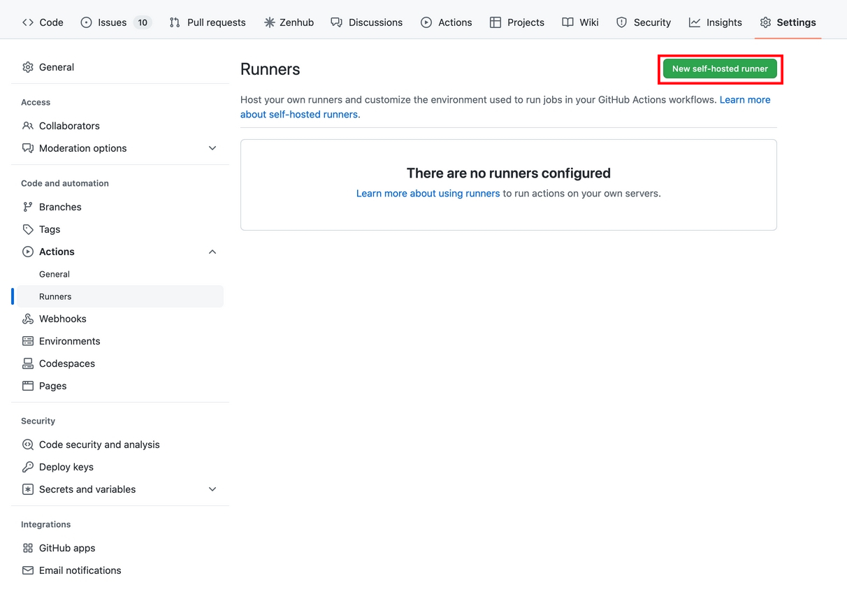 먼저 repository에서 Settings - Actions - Runners 부분을 클릭해주면 아래와 같은 화면이 나오게 되는데,