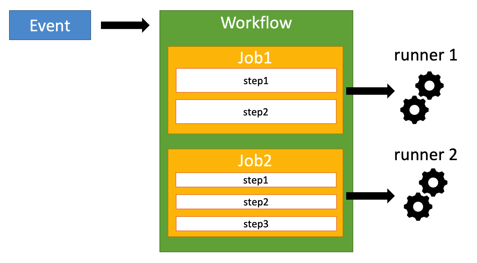대표적인 관련 용어로 Event, Workflow, Job, Action, Runner 가 있다. 각각의 특징은 다음과 같다.