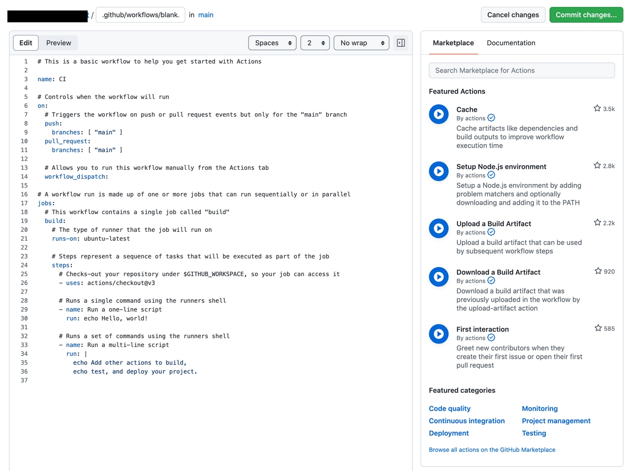 예를 들어 Simple Workflow를 누르면 아래와 같이 .github/workflows/blank.yml 파일 생성하는 과정이 나온다.
