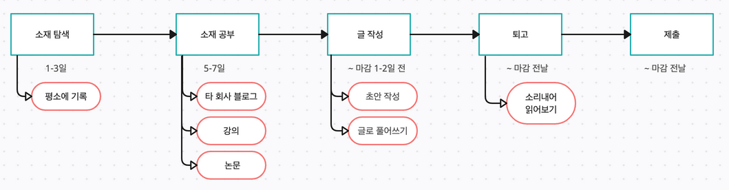 이전에는 소재만 뭐할지 고민하는데 대부분의 시간을 보내다가 마감 전날부터 공부하고 작성하기에 급급했었는데,