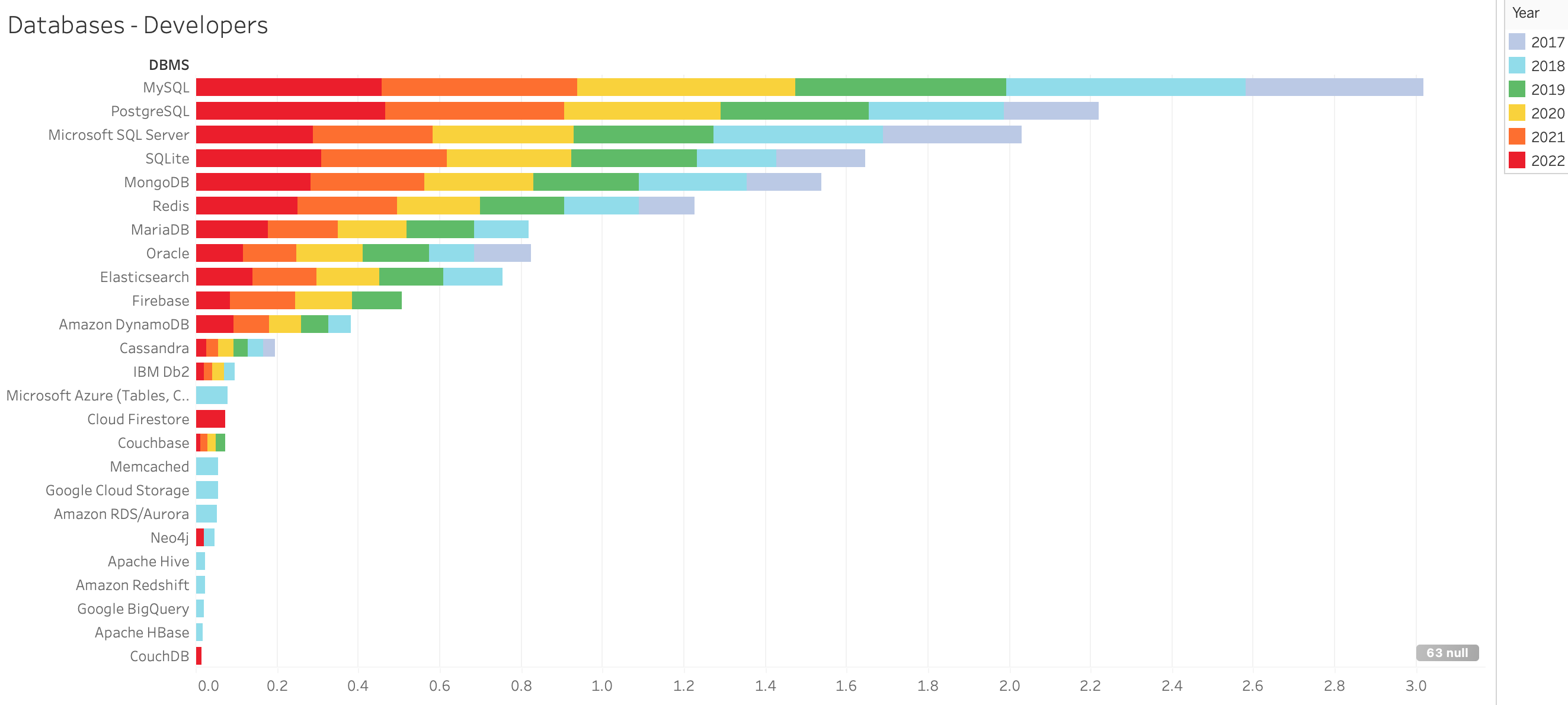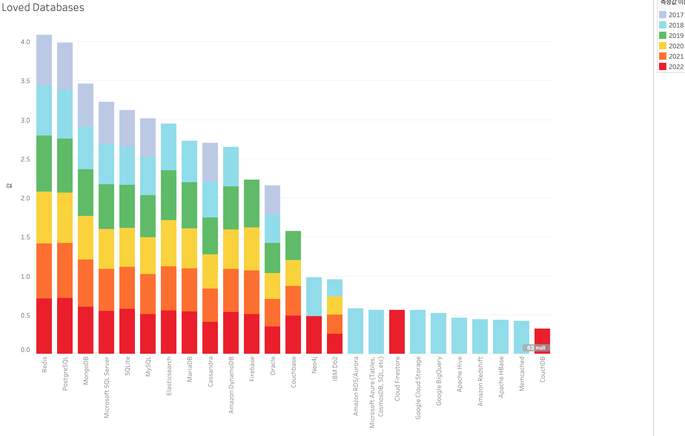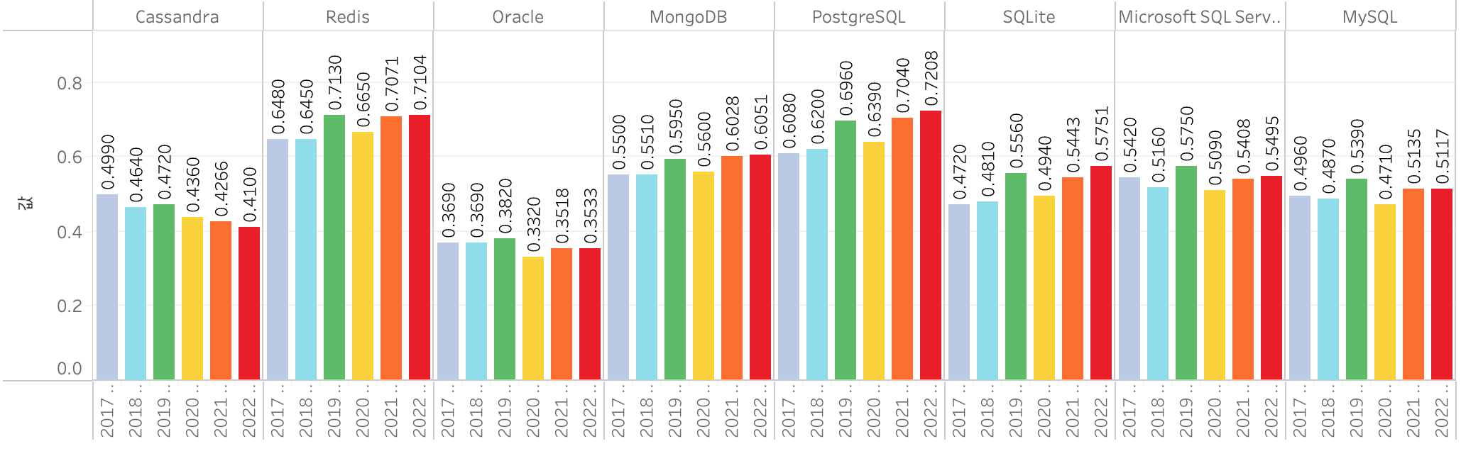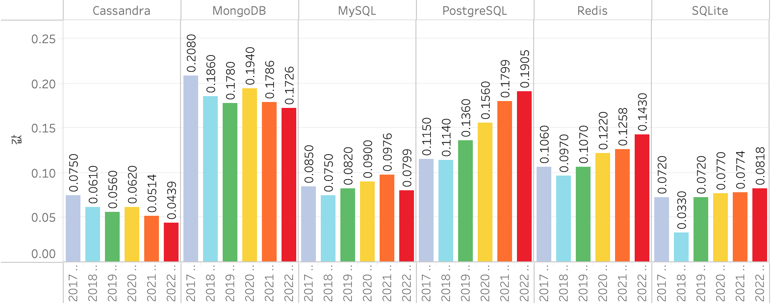 5년 내내 상위권에 있던 데이터베이스는 Redis, PostgreSQL, MongoDB, Microsoft SQL Server, SQLite, MySQL 등으로 인기 있는 데이터베이스와 유사했다.