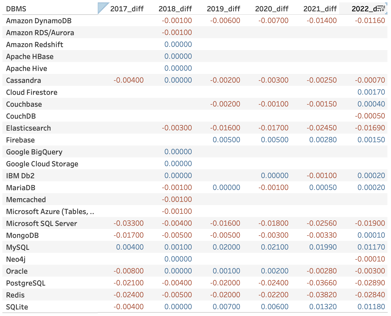 5년 안에 새로 순위권에 들었던 데이터베이스는 Elasticsearch(2018년 이후), MariaDB(2018년 이후), Amazon DynamoDB(2018년 이후), Firebase Realtime Database(2019년 이후) 등이 있었으며,