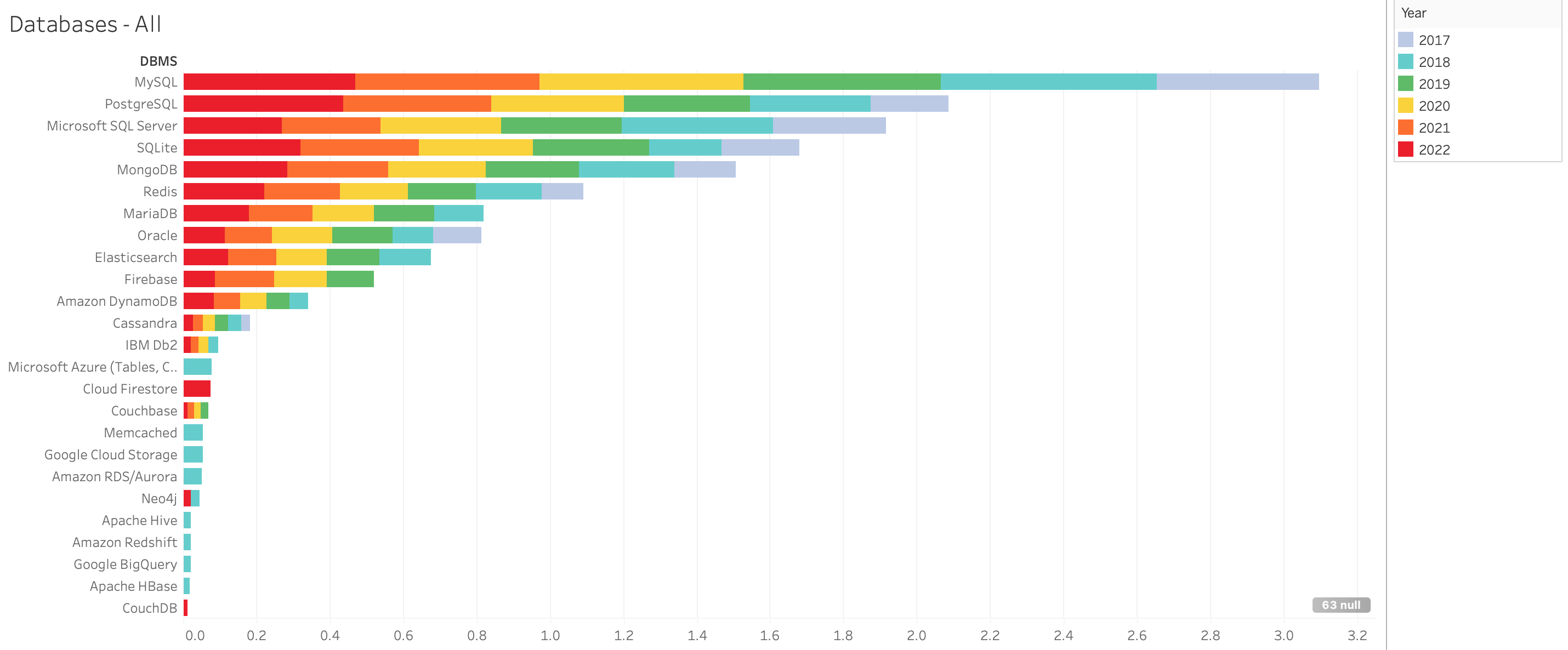 Redis, MongoDB, PostgreSQL, SQLite는 (2020년을 제외하고) 꾸준히 상승한 것을 볼 수 있다.