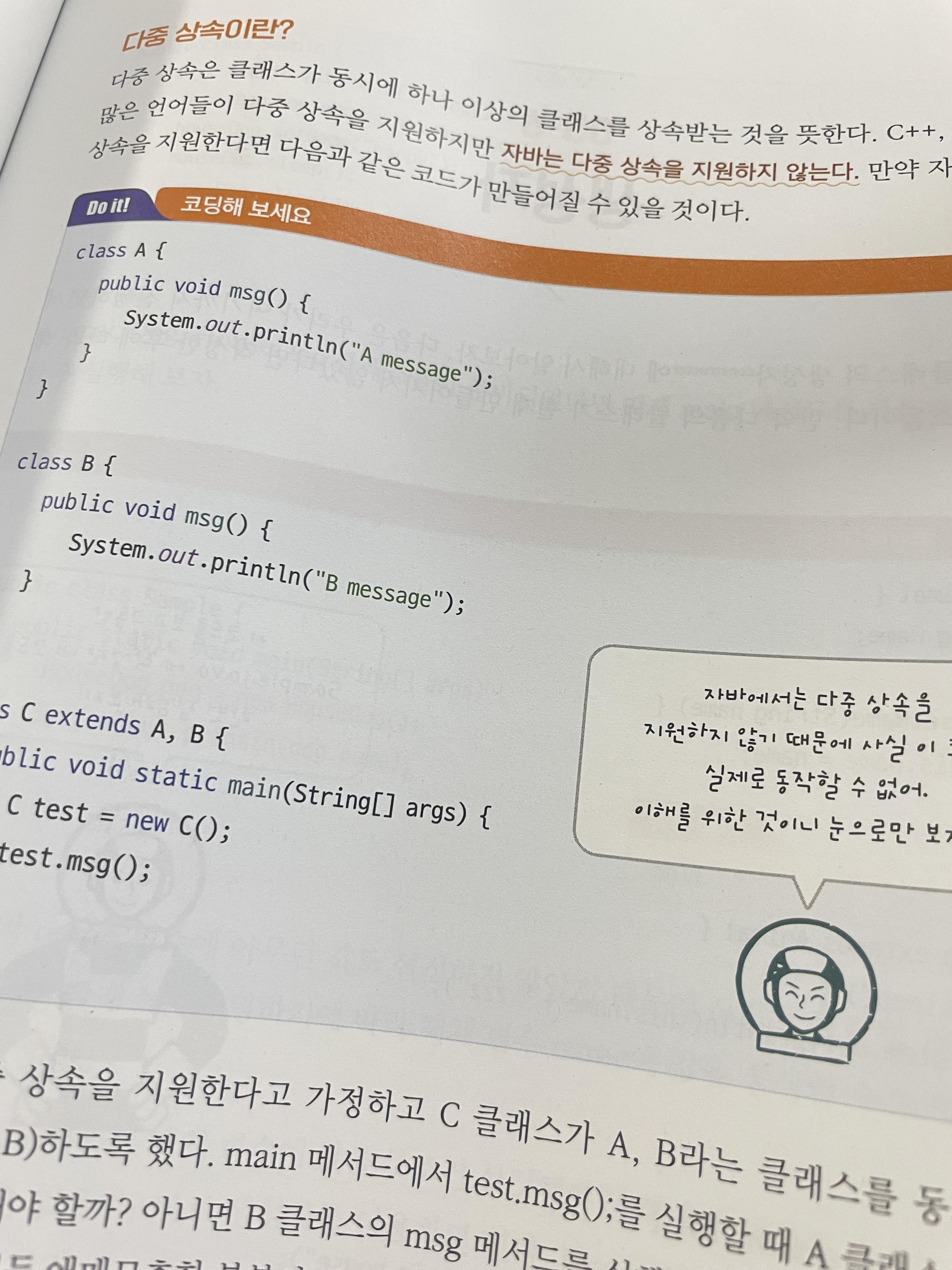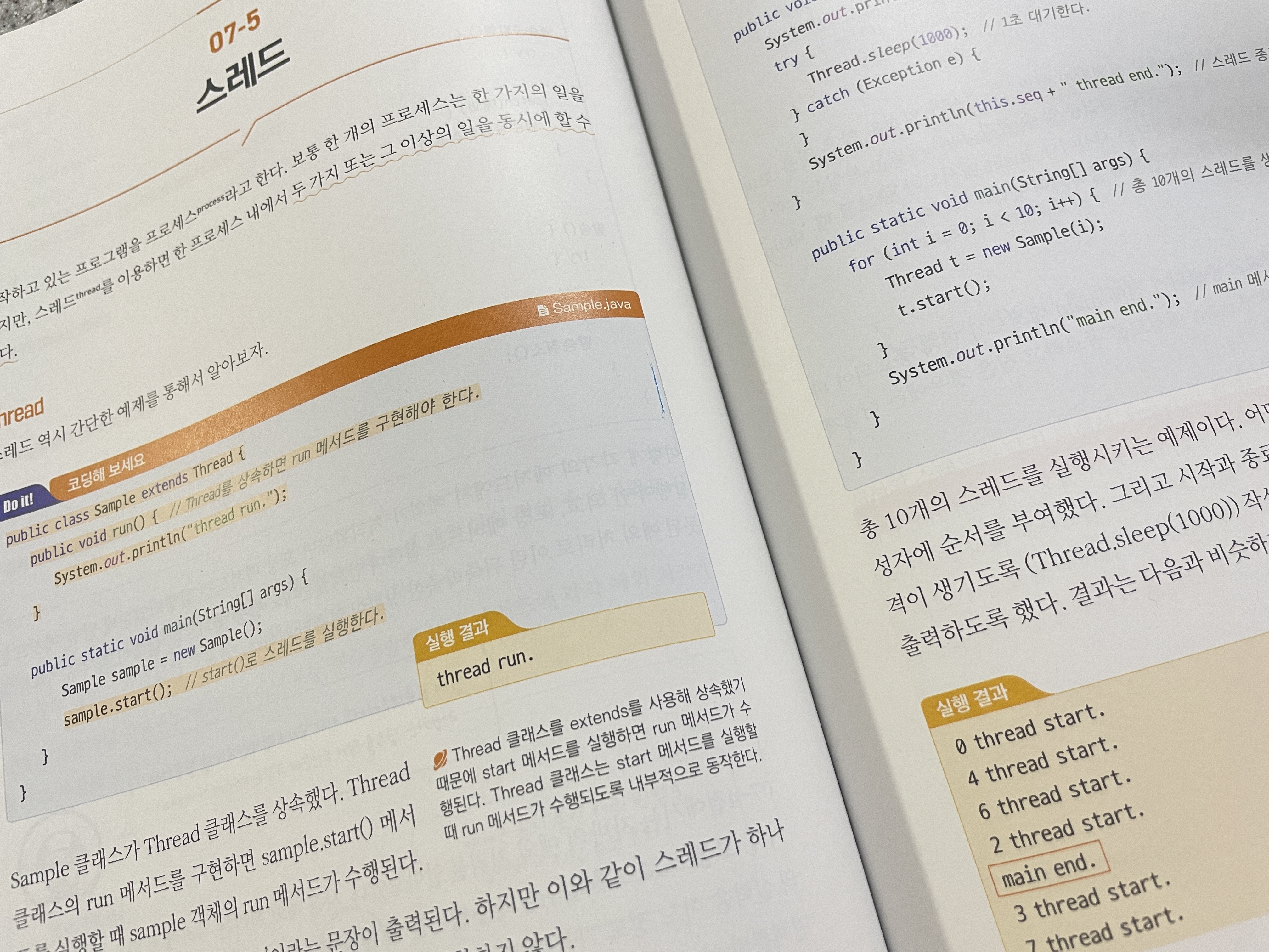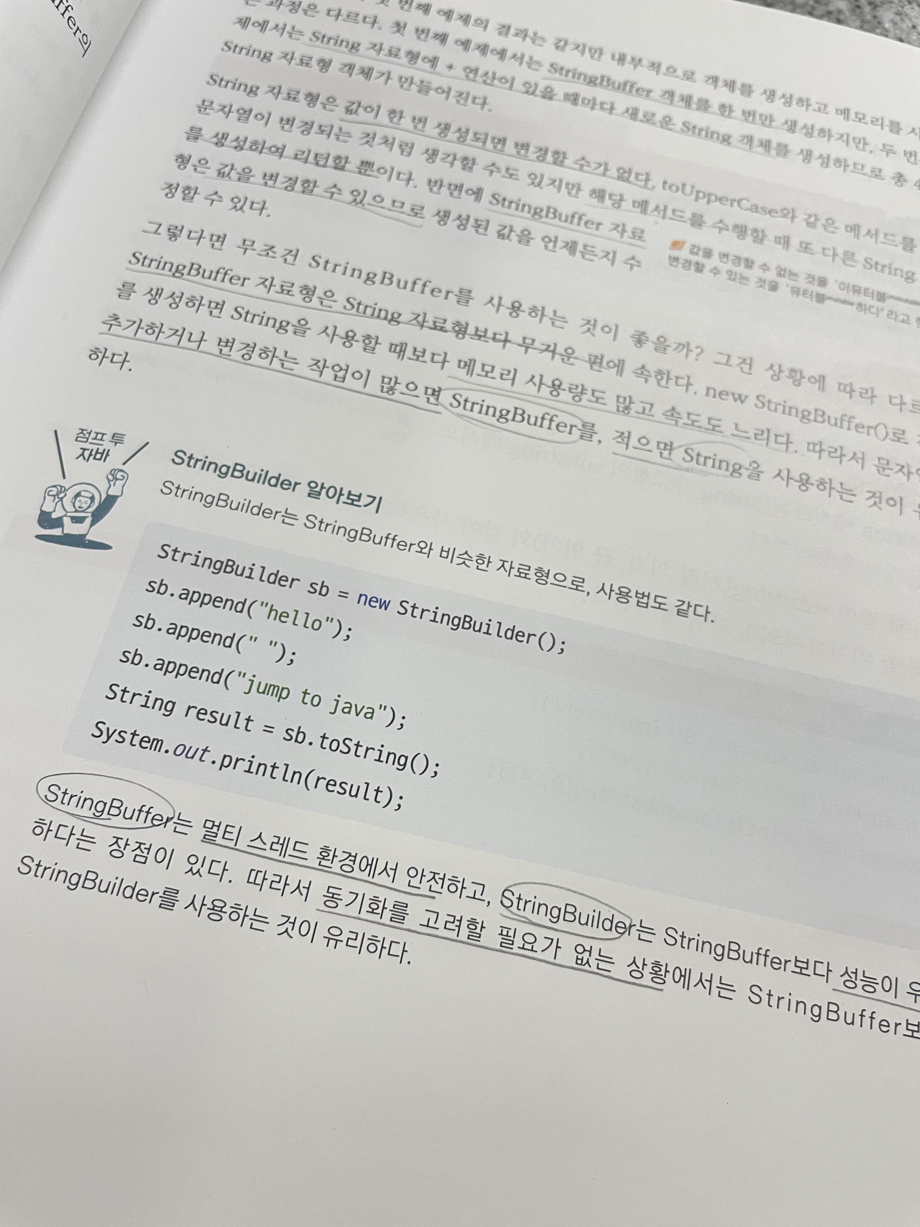 자바의 기본 데이터 타입부터 시작해서, 컬렉션 프레임워크, 제네릭 등의 중요한 개념을 차근차근 알려주며, 문자열 처리와 관련하여 StringBuffer와 StringBuilder의 차이와 활용법 등도 상세하게 다루어져 있었다. 또한, 중간마다 코드로 설명해주는 “코딩해 보세요” 섹션은 이론 설명이 실제 코드로 구현되어 있어서 체계적으로 학습할 수 있었다.