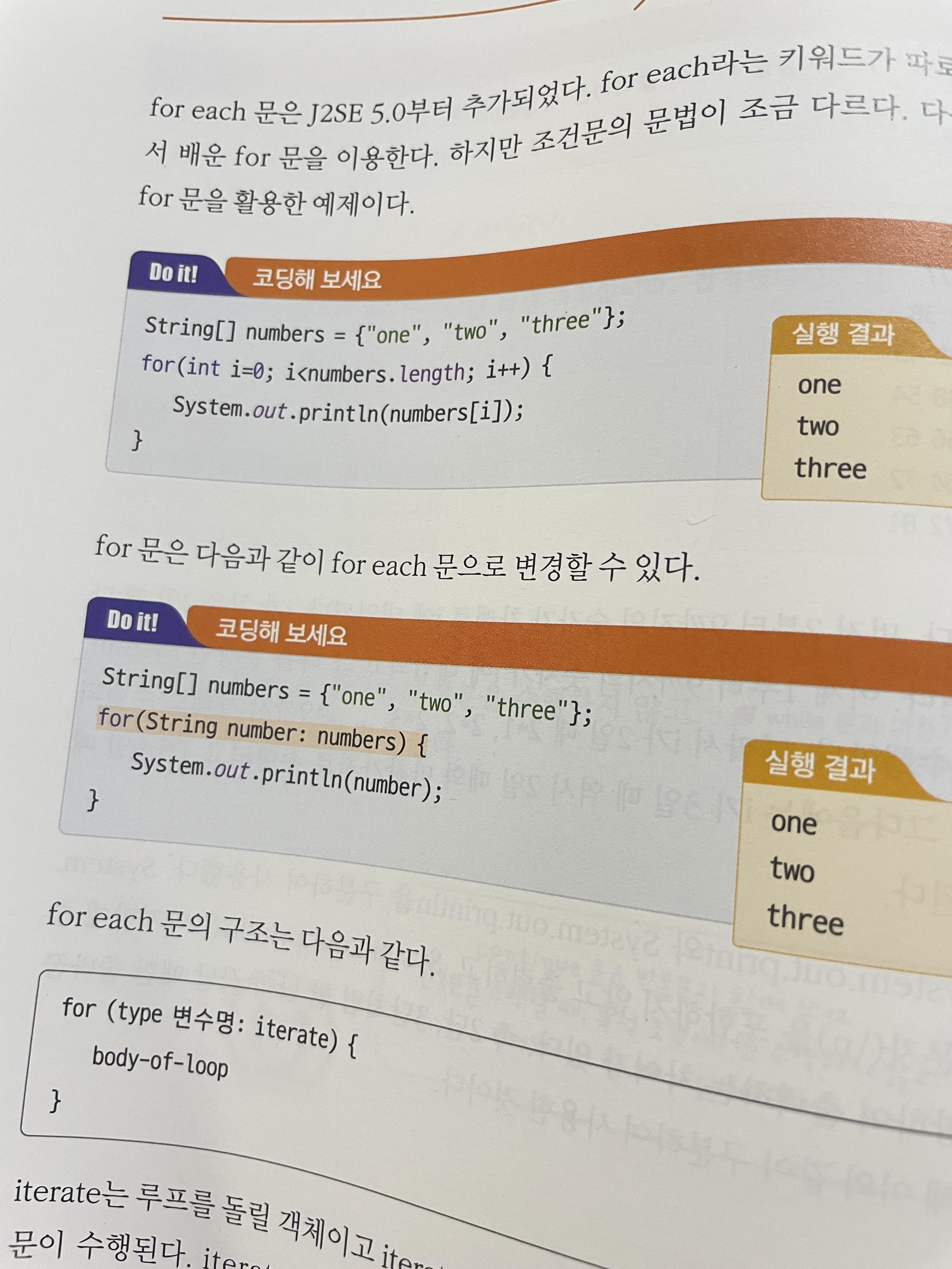 제어문 부분에서는 switch/case 문이랑 for each 문이 인상적이었다. 파이썬에는 없는 switch/case문과 for 문보다 배열 등을 기반으로 더 잘 다룰 수 있는 for each 문을 통해 좀 더 가독성있는 코드를 작성할 수 있다는 부분이 매력적으로 다가왔다.