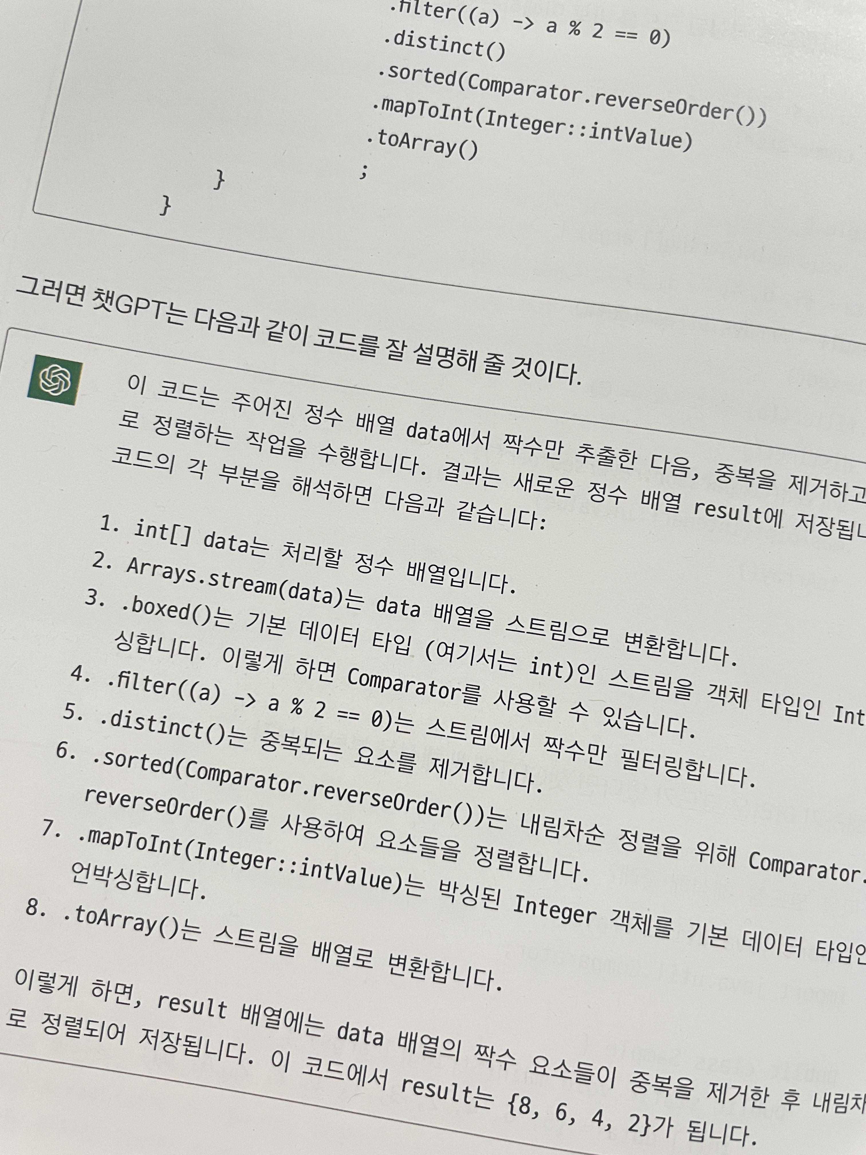 마지막 부록을 통해서는 면허 시험 15제라는 재밌는 제목으로 잘 이해했는지 점검해볼 수 있는 코딩테스트..까지는 아니지만 유사한 문제들을 풀어볼 수 있었고, chatgpt를 통해 공부하는 방법을 통해서는 자바 뿐만 아니라 다른 언어에도 접목시킬 수 있는 팁을 얻을 수 있었다.
