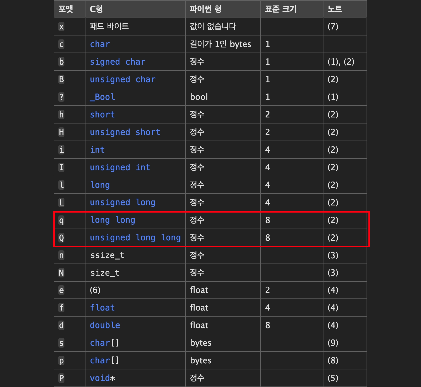int도 real과 마찬가지로 signed 여부에 따라 '<Q'와 '<q'로 format을 다르게 지정하여 진행되었다.
