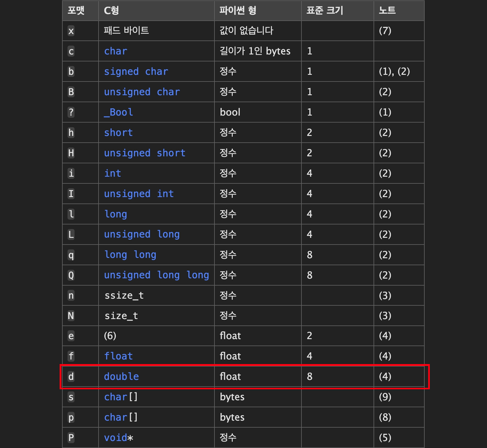 https://docs.python.org/ko/3/library/struct.html#format-characters에 따라 unpack할 format을 지정해주었다.