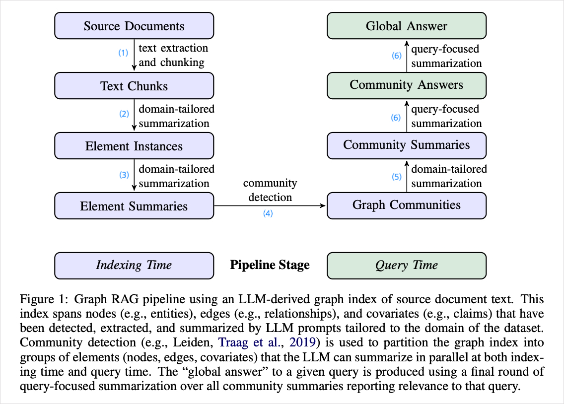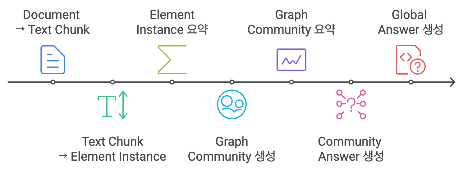 GraphRAG는 위 구조도과 같은 단계로 진행되는데, 각 단계는 아래와 같이 진행된다.
