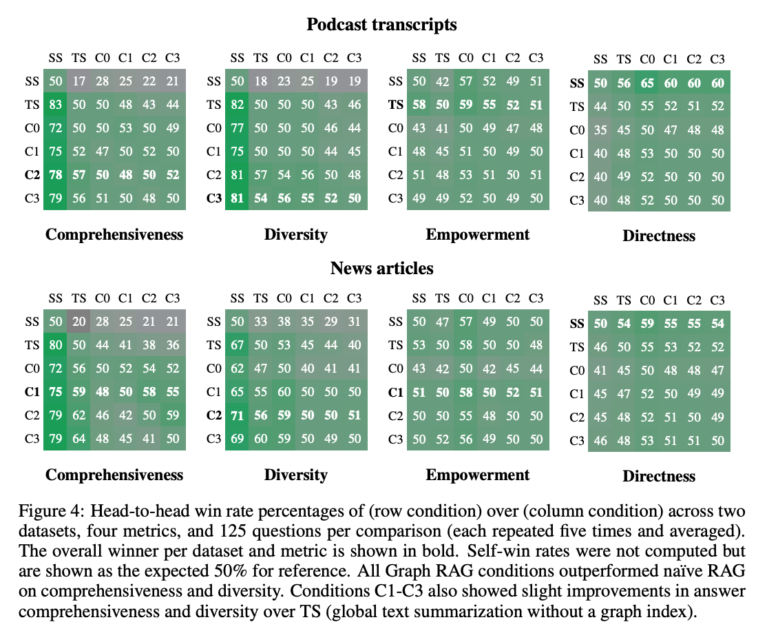 - Community Summary들을 활용한 Graph RAG는 source text보다 포괄성(comprehensiveness)과 다양성(diversity)에서 좀 더 좋은 성과를 보였다.