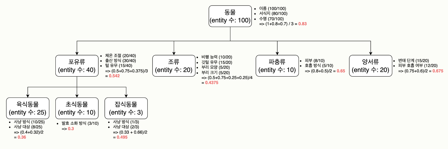 (아래 분류체계 및 수치 정보는 모두 실제 개체 및 속성 수를 나타내는 것이 아닌, 그저 예시일 뿐이다..!)