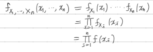 이는 서로 독립이기 때문에 결합분포는 각 주변분포의 곱으로 나타낸다. 그러나 이는 동일한 분포를 따르기에 X_i에서 i값에 관계없이 동일한 확률질량(밀도)함수를 가진다.