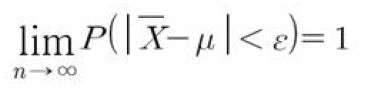 즉, 표본평균은 μ를 중심으로 분포되어 있다는 것이다. 여기에서 분산의 분모에 n이 있으므로 n이 커질수록 분산은 0에 수렴하고, 기댓값은 μ에 수렴한다. 이를 수식적으로 표현하면 아래와 같은데, 모든 ε에 대해 표본평균과 가 벗어날 영역이 n이 커지면 1에 수렴한다는, 즉 이 영역 밖으로 갈 확률은 0이 된다는 것을 나타낸다.