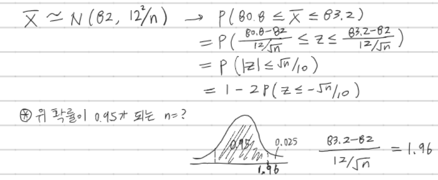 ex2) 평균 82, 표준편차 12인 모집단(어떤 분포인지는 모름)에서 확률표본 추출 시 P(80.8 ≤ X_bar(표본평균) ≤ 83.2)의 확률은?