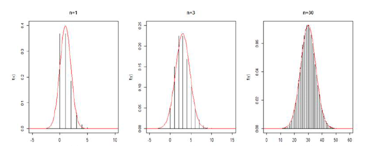 ex1) Xi~Poi(1) (iid) 에서 표본합의 표집분포 X1+...+Xn ~ Poi(k) 형태를 보면 n이 커질수록 정규분포의 형태에 가까워진다.