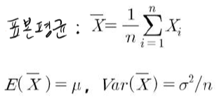 X1, ... , Xn은 평균이 μ이고 분산이 σ^2인 모집단에서 추출된 확률표본이다. 이들의 평균인 표본평균과 기댓값, 분산은 다음과 같이 나타낼 수 있다.