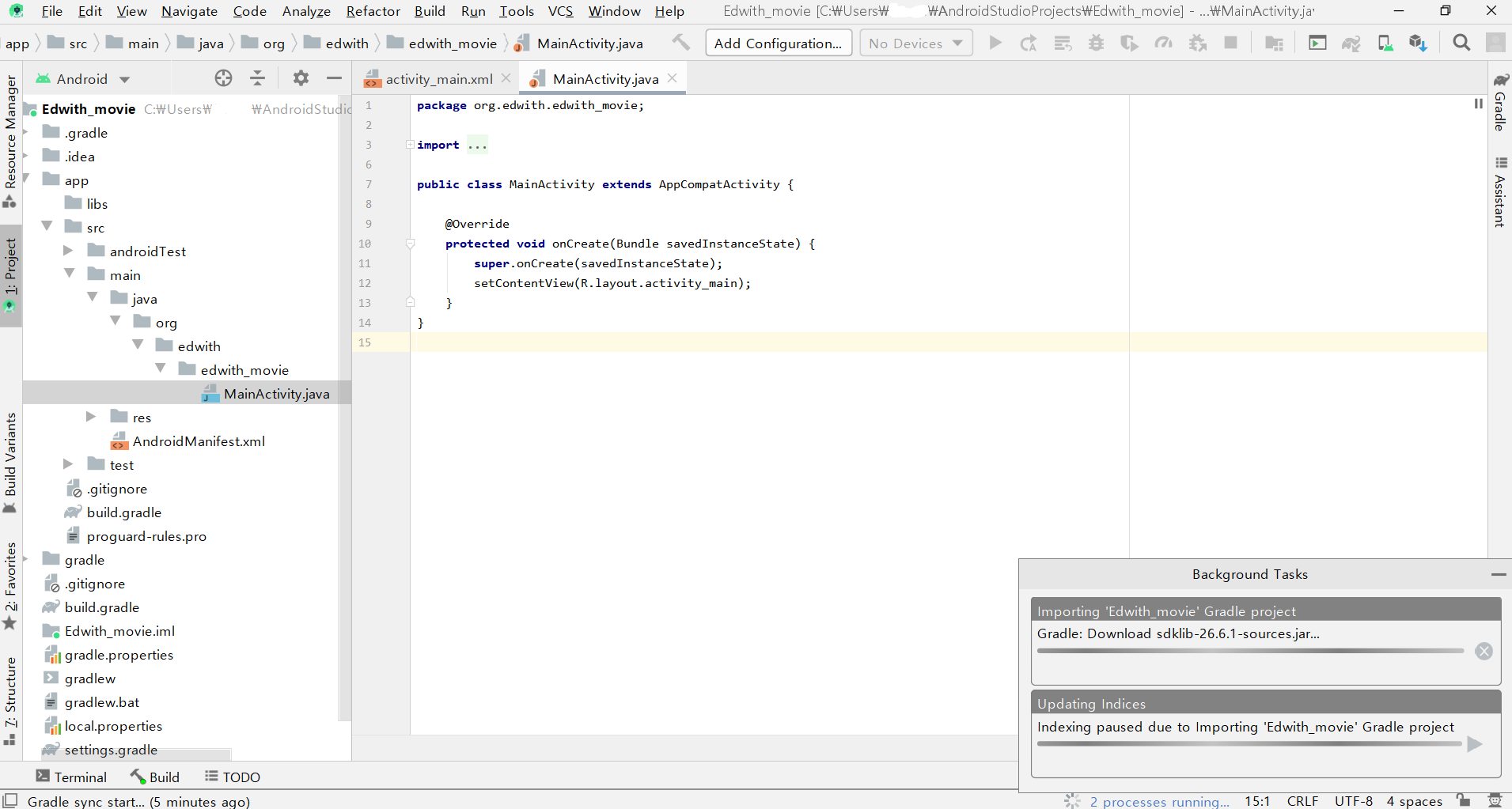 그리고 Finish를 눌러주면 이런 화면이 뜨면서 프로젝트 생성이 완료된다. 아래 창을 보면 프로젝트를 위해 추가적인 다운로드가 되고 있는 것이 보이는데, 앞에서 설정한 minimum SDK에서 필요한 것들이 새로 다운로드된다. 왼쪽에는 트리 모양으로 파일 구성에 대해 쭉 나와져있고, 오른쪽에는 작업 영역으로 필요한 파일들이 탭 모양으로 열린다.
