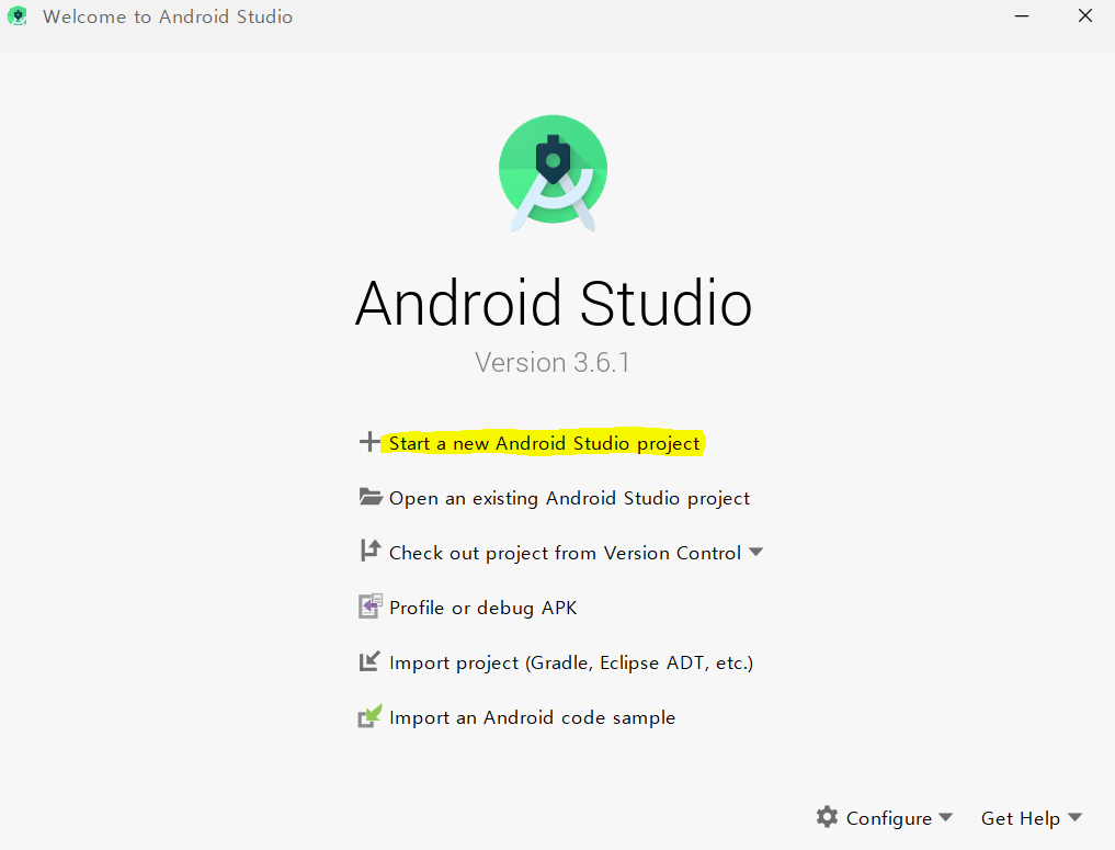 이번에는 안드로이드 스튜디오(3.6.1 버전)를 통해 새로운 프로젝트를 만드는 방법에 대해 알아보자. [안드로이드 스튜디오 설치 방법] 우선 새롭게 설치한 따끈따끈한 안드로이드 스튜디오를 열어 '+ Start a new Android Studio project'를 클릭한다.