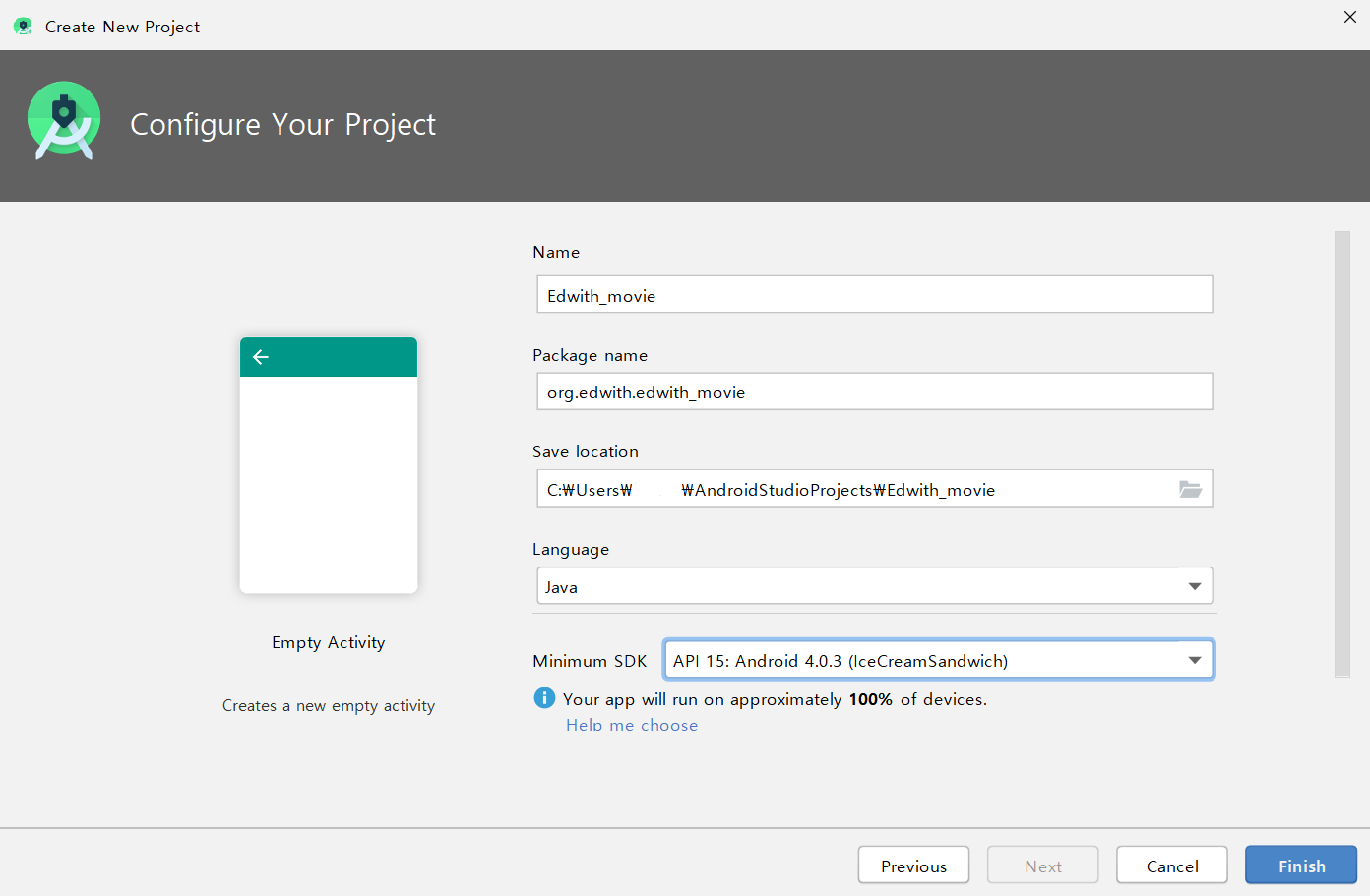 Next를 누르면 프로젝트 이름 등을 정하는 화면이 나온다. 세부사항은 아래와 같이 적어주면 된다.