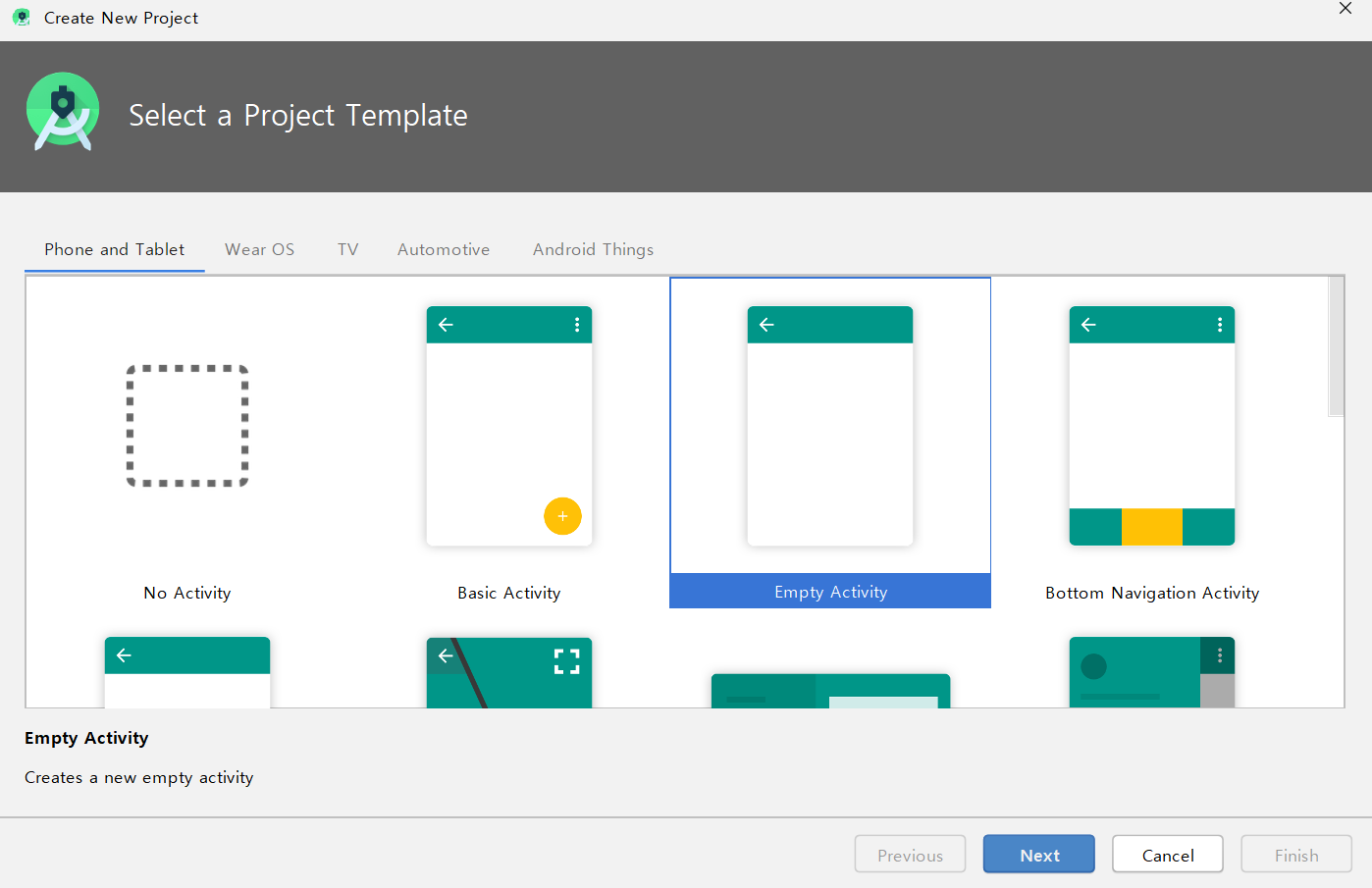 그러면 아래와 같은 화면이 뜨는데, 첫 화면을 어떤 템플릿으로 할 것인지 정하는 것이다. (기본적으로 빈 화면인 Empty Activity를 많이 사용하는 것 같다.)