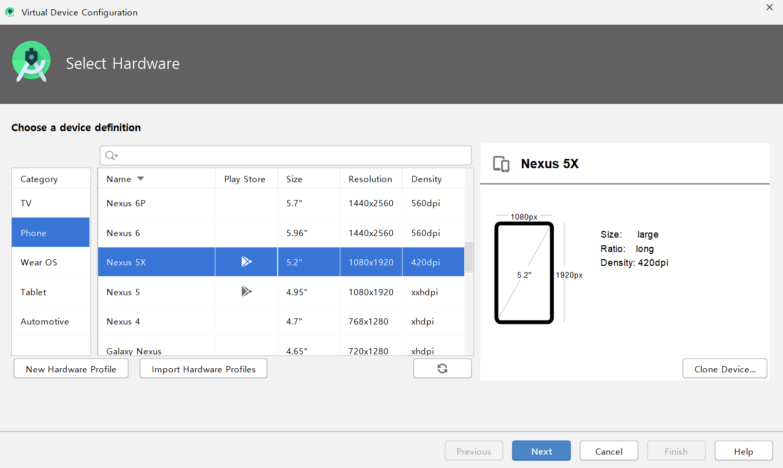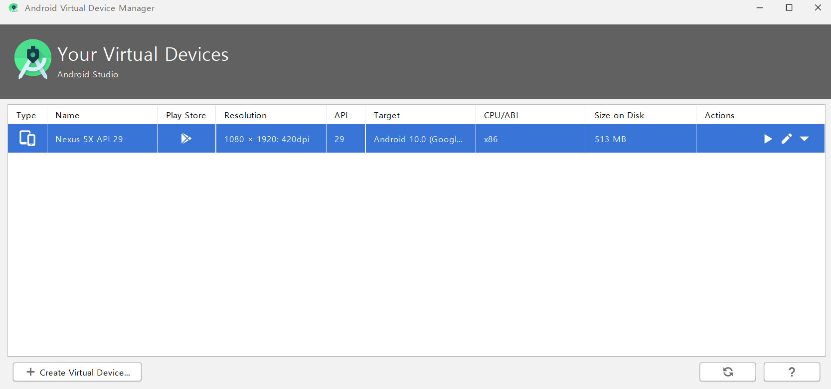 여기에서는 만들어진 가상 단말들이 뜨게 되며, 오른쪽의 ▶ 버튼을 누르면 에뮬레이터가 실행된다.