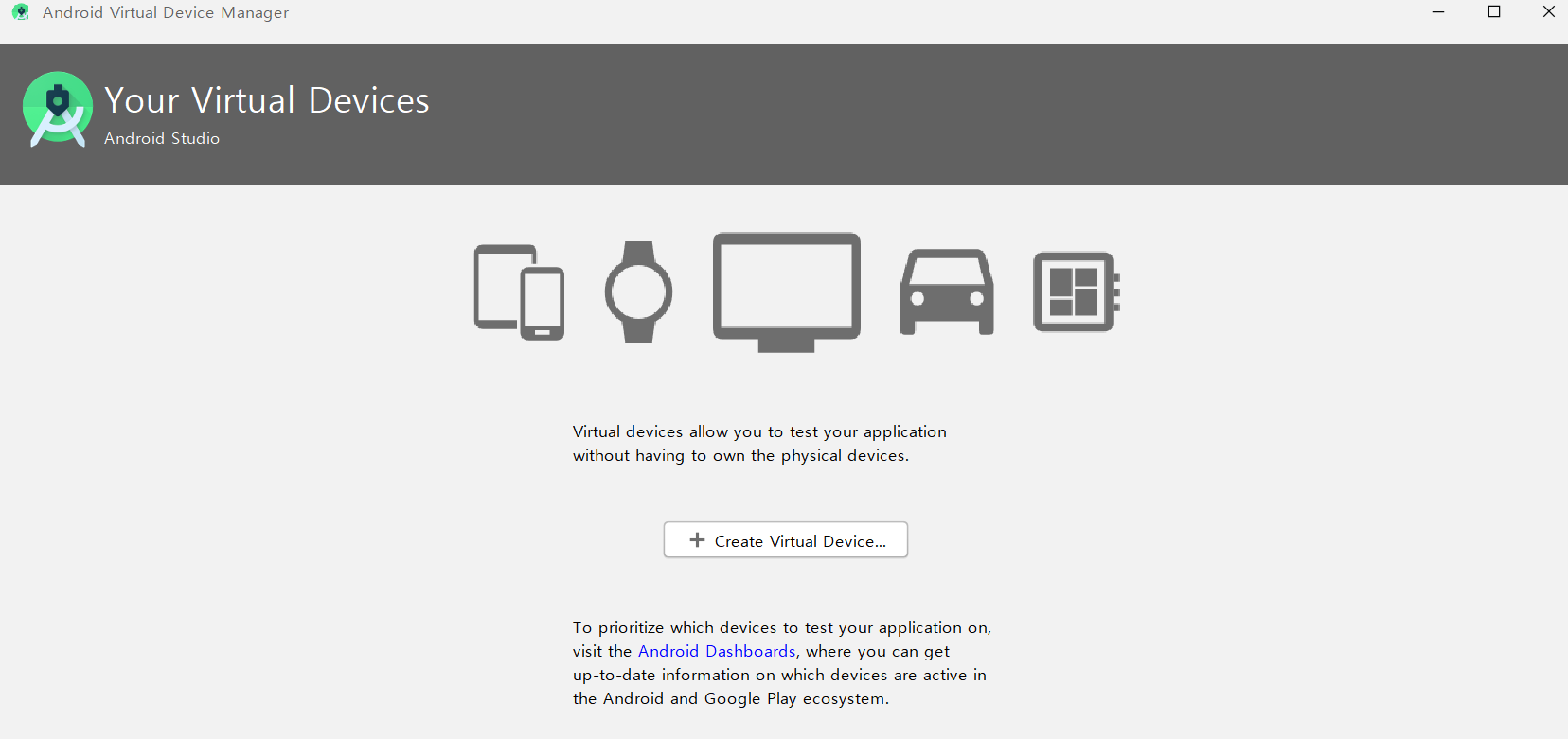 그러면 이런 창이 뜨게 되는데, Virtual Devices가 즉 가상 단말을 말하는 것이다. (너무 당연한가)'+ Create Virtual Device...' 버튼을 클릭해준다.