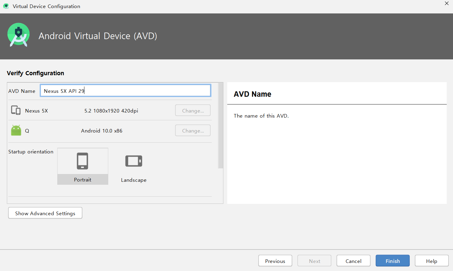 다음에는 화면을 세로형으로 만들건지 가로형으로 만들건지 등을 선택하고 Finish를 눌러준다.