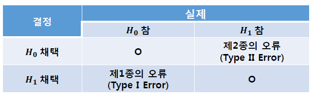 위의 방법에서 어느정도 작을수록, 클수록인지 그 기준인 유의수준은 오류의 종류와 함께 설명하고자 한다.