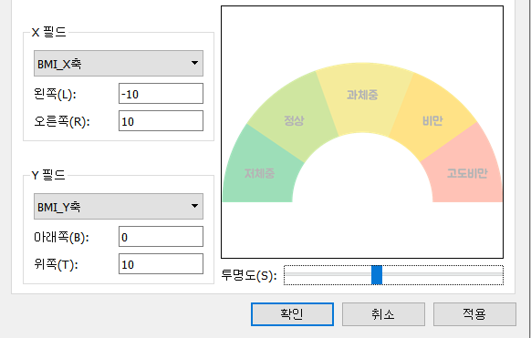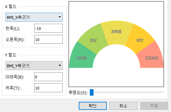 생성했던 계기판 그림을 [파일 또는 URL]에 넣어주고 생성한 X축과 Y축을 각각 X 필드와 Y 필드로 설정한다.