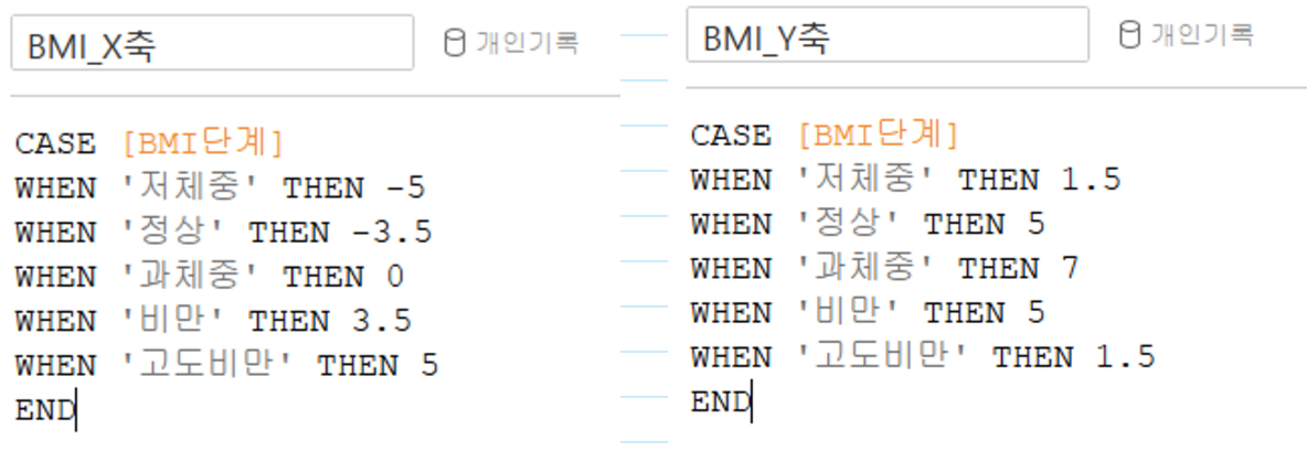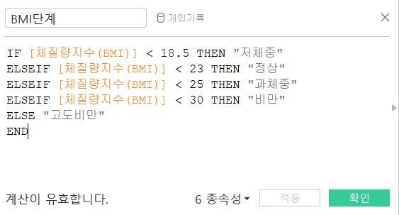 우선 나타낼 변수는 BMI로, BMI 지수마다 범주화를 한 필드를 생성해주었다.