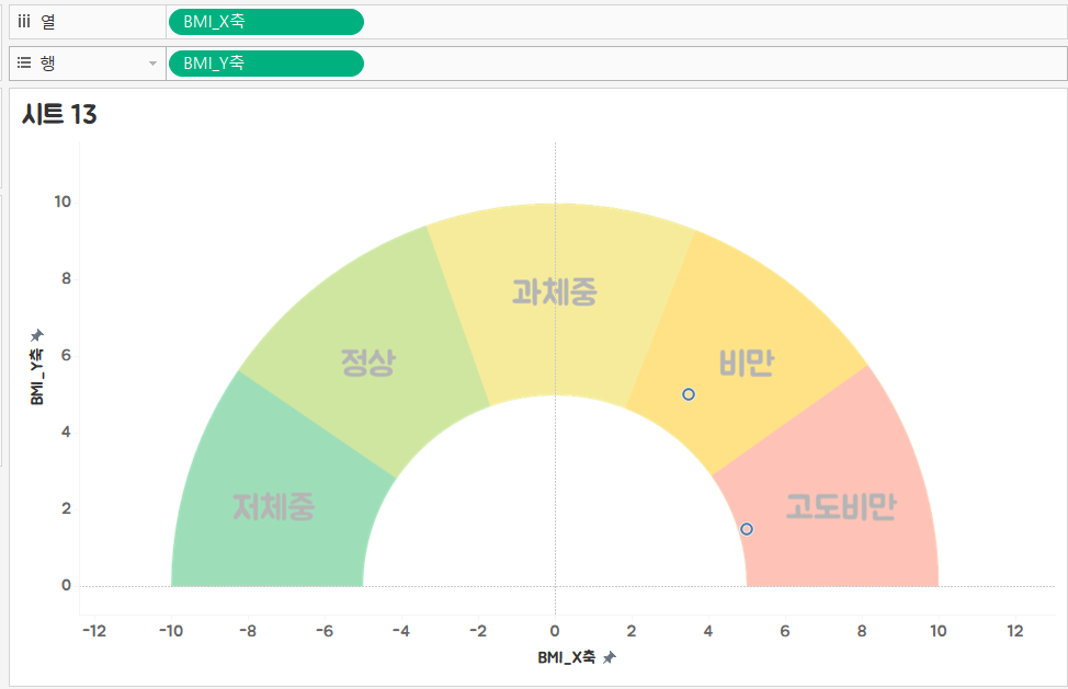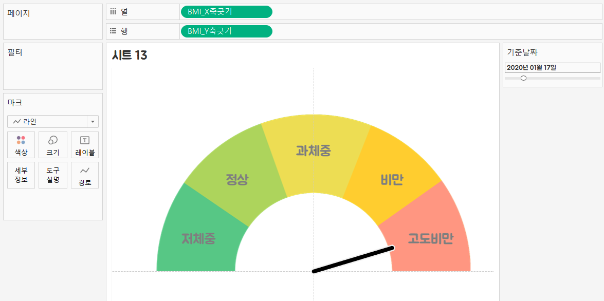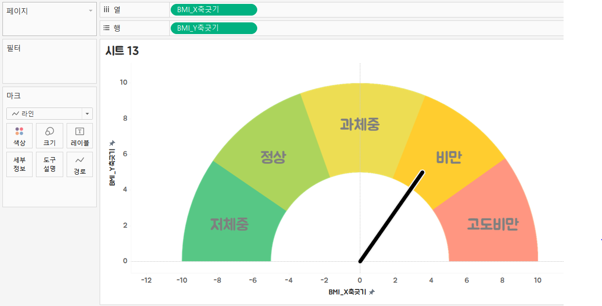 다시 행과 열에도 IIF를 통해 만든 변수를 넣어준 뒤, 마크를 라인으로 변경해주면 아래와 같은 계기판이 생성되는 것을 확인할 수 있다.