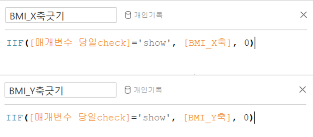 여기에서의 IIF 함수를 해석해보면, 설정한 매개변수(매개변수 생성 포스트 참고)와 값이 일치할 경우에는 [X, Y축]을 반환해주고 아닌 경우에는 0을 반환해준다는 것을 의미한다.