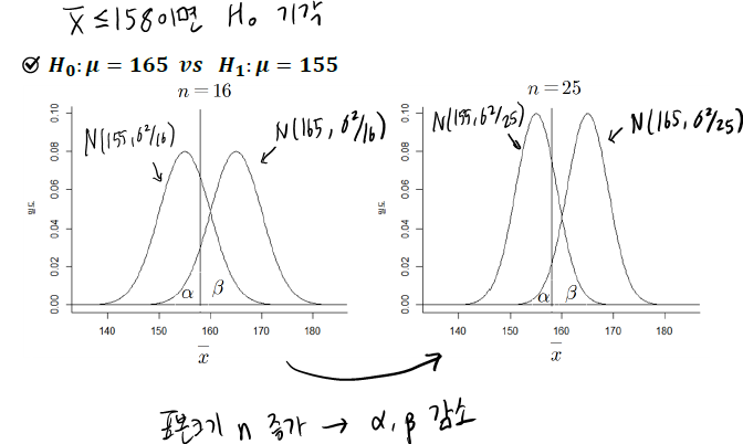 아래 그림에서 n이 커지면 H0, H1이 따르는 정규분포 모양이 좁아지는 것을 볼 수 있다.
