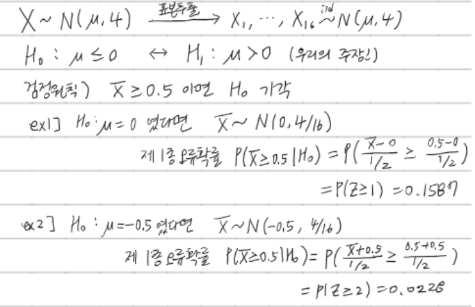 만약 가장 이상적으로 H0: μ = 0이었다면 x̅~N(0, 4/16)이 되며 제 1종 오류의 확률 P(x̅≥0.5|H0)을 계산하면 0.1587이다.