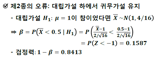 ex) 대립가설 H1 : μ =1이 참이었다고 하면 x̅ ~ N(1, 4/16)이 되어 제 2종 오류 β = P(x̅<0.5|H1) = 0.1587이고