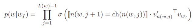 (n(w,j) : root부터 w까지의 경로 중 j번째 node, L(w) : 경로 길이, ch(n(w,j)) : 임의의 고정된 child node, [[x]] : x가 참이면 1, 거짓이면 -1, σ(x)=1/(1+exp(-x)) )